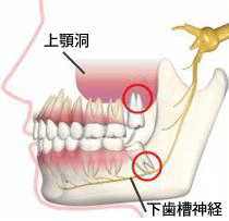 当院では、親知らずなどの難易度の高い抜歯(右図)・口腔内の炎症・顎関節症・嚢胞(膿)の除去・歯や唇の外傷・良性腫瘍などの治療を行っております。